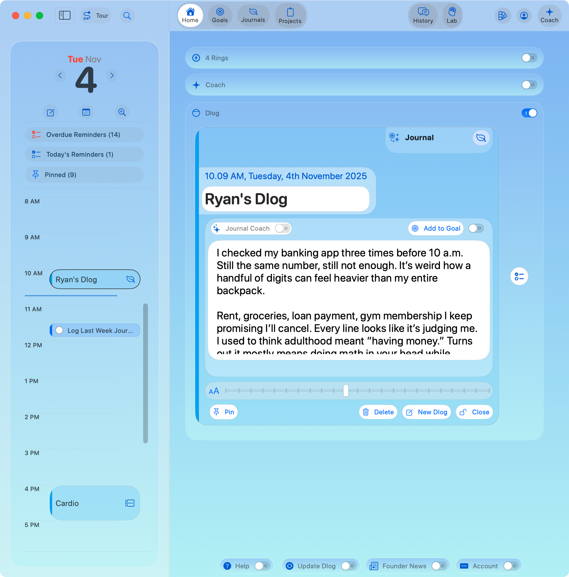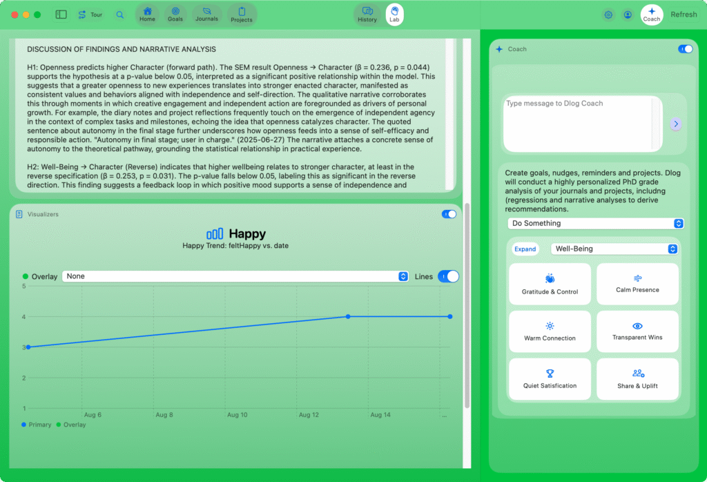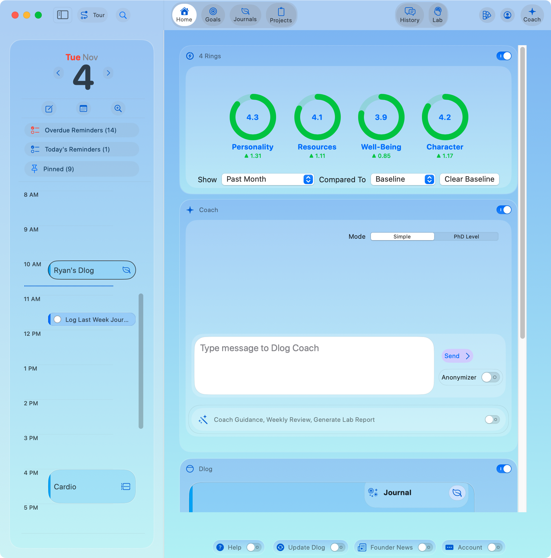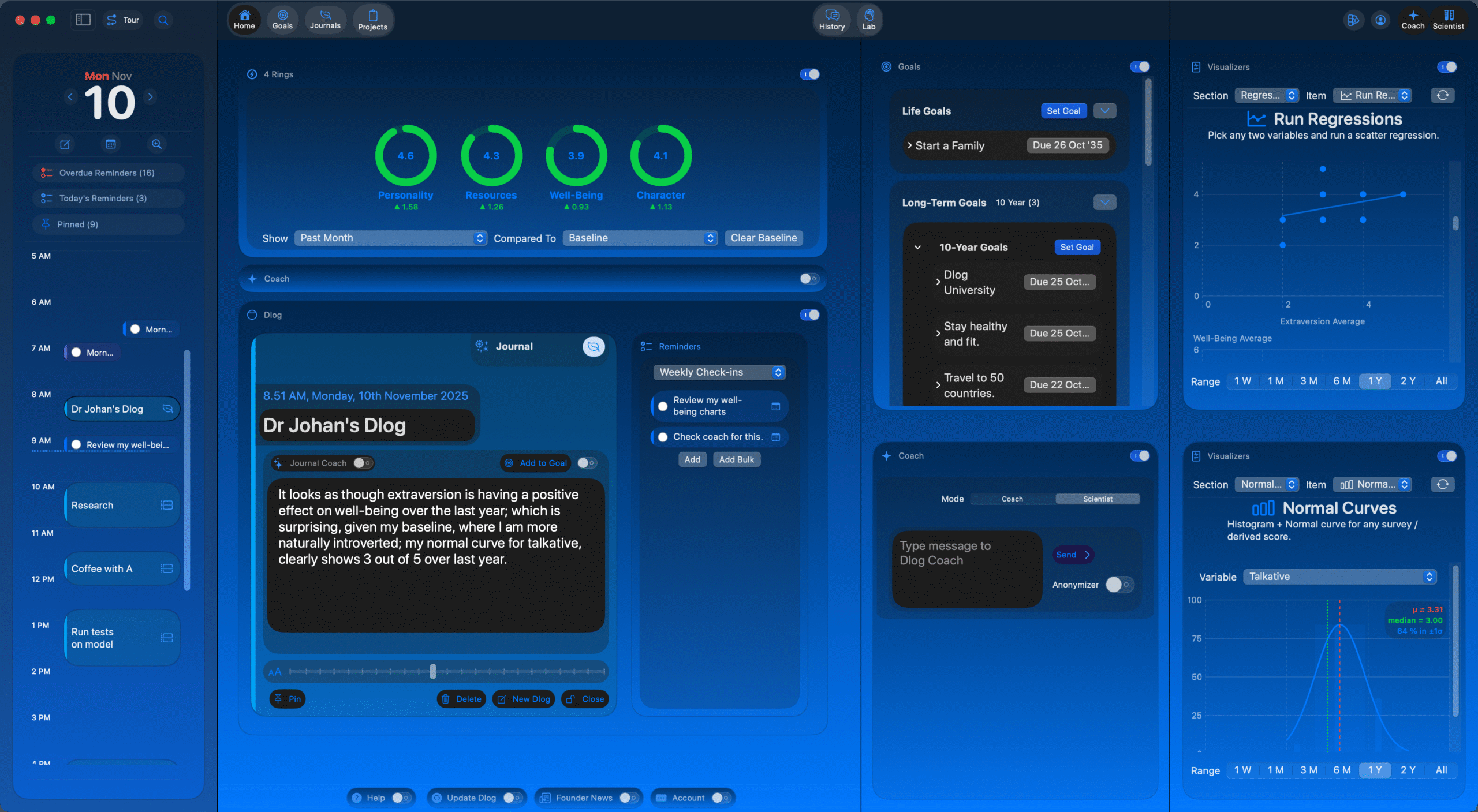 Start journaling and planning in Dlog, then invite Coach and Scientist to help you understand what really drives your life. One quiet Mac app, no accounts, your data on your machine.