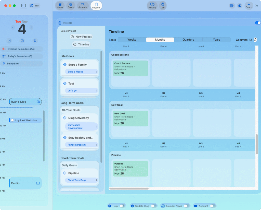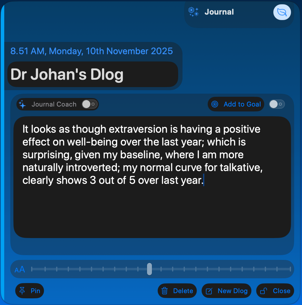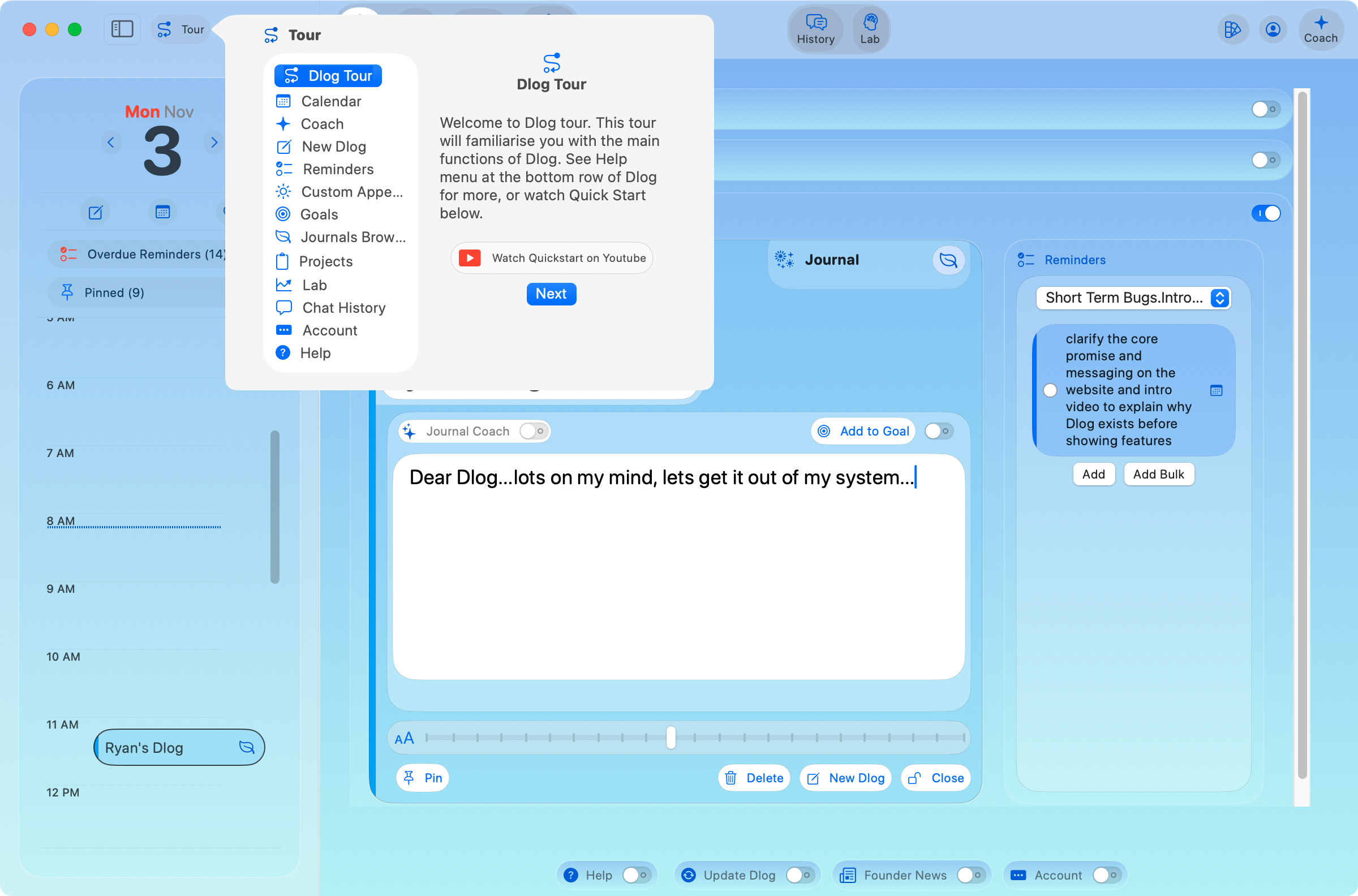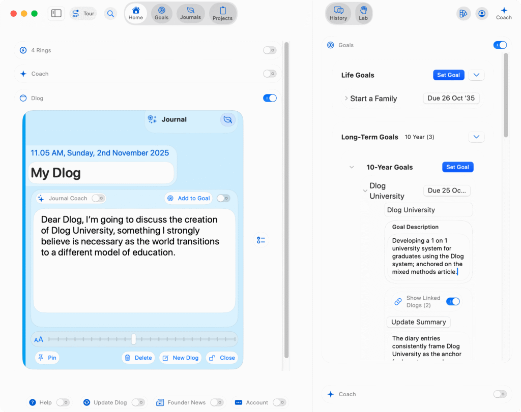 Start journaling and planning in Dlog, then invite Coach and Scientist to help you understand what really drives your life. One quiet Mac app, no accounts, your data on your machine.