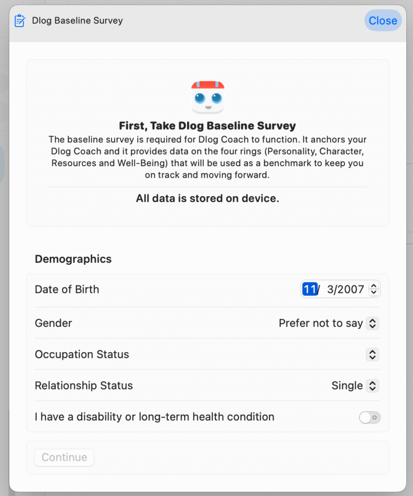 Journals, baseline, scoring, and analytics run on your Mac. No account required.