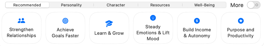 Above your Journal on the Home page are the 4 Rings and Coach. The AI Coach is trained on your “Four Rings of Life”. See example stories below.