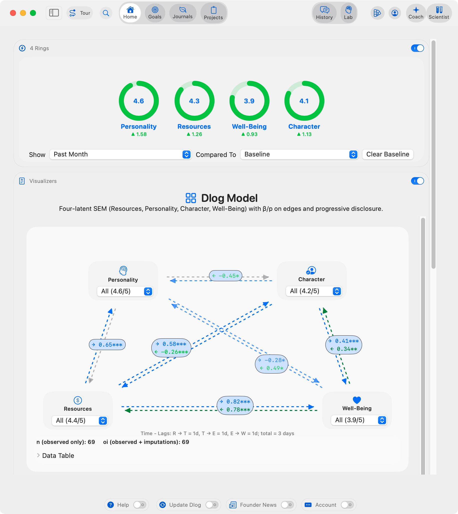 Dlog runs a Four Rings baseline, driver estimates, visualisers and a mixed-methods report that blends numbers with journal excerpts for deep Personal Science.