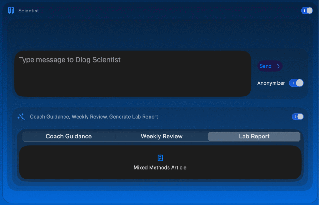 You choose which journals or projects the Coach or Scientist can see. You can work entirely offline if you prefer to use Dlog without AI.