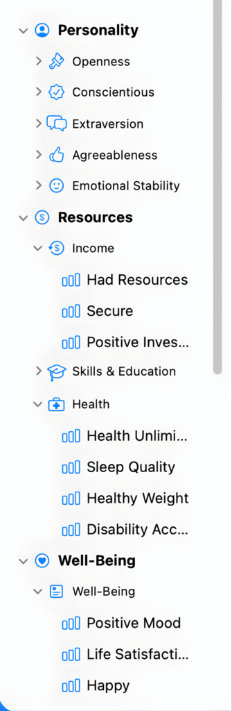 - Well-Being. Mood, energy, satisfaction, and thriving.